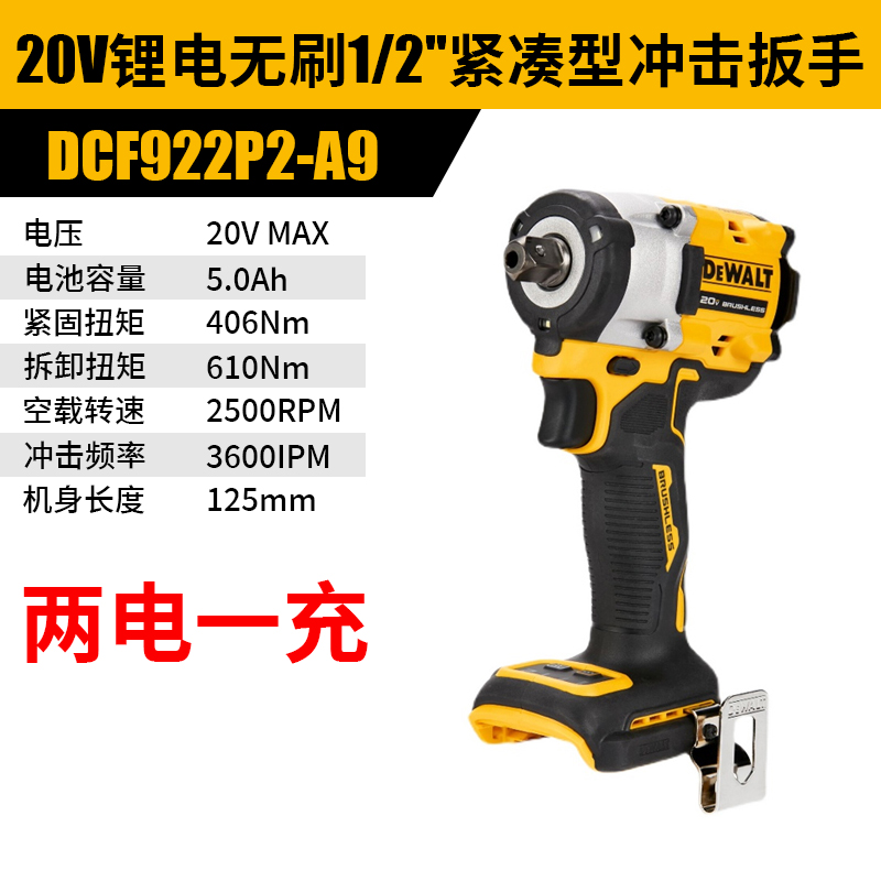 得伟20V锂电无刷1/2"紧凑型冲击扳手 20V*5.0Ah*2 DCF922P2-A9